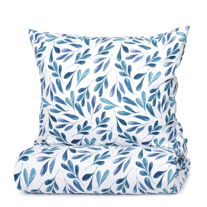 - Kenmerken: Het heldere RINTA beddengoed heeft een witte achtergrond met subtiele bladeren in contrasterende blauwtinten. De set bevat een 160x200 cm dekbedovertrek en twee kussenslopen van 70x80 cm, sluit met een rits.