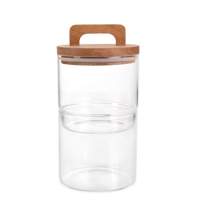 Ein Glasbehälter zur Aufbewahrung von Lebensmitteln in der Küche. Der RLOS-Behälter besteht aus 2 kleineren Behältern, die übereinander gestapelt werden, um Platz im Schrank oder auf der Theke zu sparen. Der obere Container hat ein Holzdeck