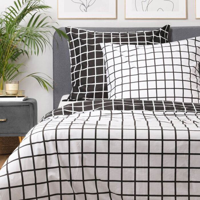 Das REYES Bettwäscheset umfasst einen 220 x 200 cm Deckenbezug und zwei 70 x 80 cm Kissenbezüge. Der Reißverschluss des Deckenbezugs befindet sich an der längeren Seite. Das schwarz-weiße Kartenmuster dominiert beide Seiten der Bettwäsche - eine Seite ist schwarz mit weißem Rautenmuster und die andere Seite ist weiß mit schwarzem Rautenmuster. Sie entscheiden, welche Farbe Ihnen am besten gefällt! REYES ist auch in anderen Größen erhältlich.