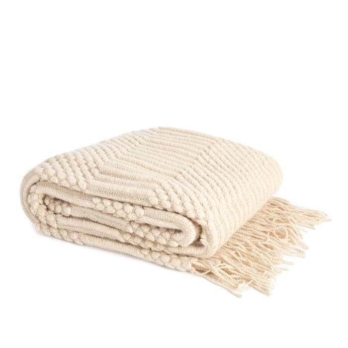 Eine warme Decke ist ein unverzichtbares Accessoire in jedem Zuhause. Es ist sowohl in der Kälte als auch im Sommer nützlich, wenn sich die Abendkühle bei Partys auf der Terrasse oder entspannenden Momenten auf der Gartenschaukel bemerkbar macht. Die BERGA-Decke wärmt Sie schnell, unabhängig von Jahreszeit und Ort. Das Ganze ist in Creme-Cru-Farbe gehalten und die Oberfläche ist mit Reliefs in Form von Streifen und Punkten verziert, was einen interessanten visuellen Effekt ergibt. Die Decke wird zusätzlich mit Quasten an 2 Seiten variiert, wodurch sie äußerst ästhetisch wirkt.