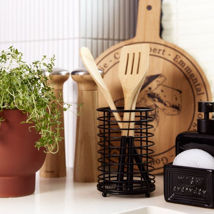 Das Besteck-Abtropfgestell bietet eine praktische Lösung, um Besteck ordentlich aufzubewahren und zu trocknen. Sein schwarzes Design fügt sich harmonisch in jede Kücheneinrichtung ein.
