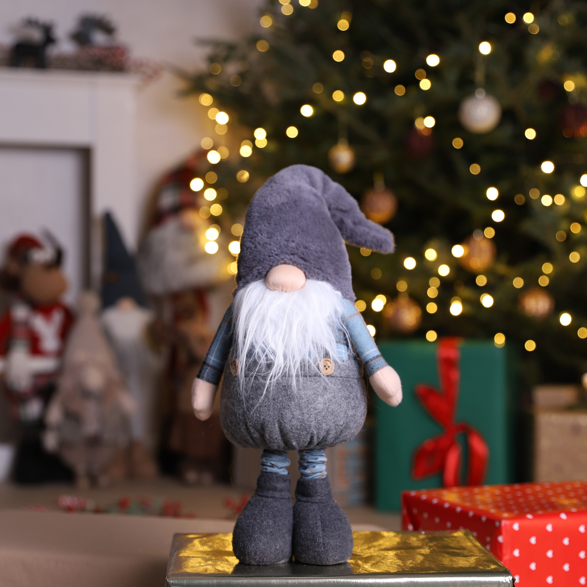 Das überdurchschnittliche Design und die kühlen Farben zeichnen diese Weihnachtsdeko aus. Die gesamte Dekoration ist in Weiß- und Grautönen gehalten, ergänzt durch ansprechende blaue Akzente. Die charakteristischen langen Beine und der gemütliche Hut, der bis zu den Augen der Figur reicht, ziehen ebenfalls die Blicke auf sich und verleihen Ihrer Weihnachtsdekoration eine magische Note.