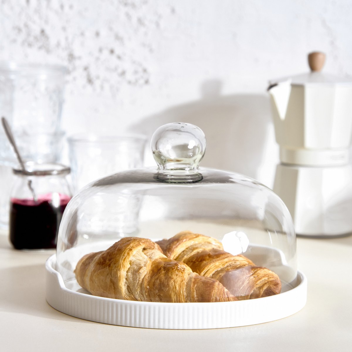 Der FINCAN-Teller besteht aus einem Glasdeckel in Form eines Halbkreises und einer hellgrauen Porzellanunterlage. Mit Abmessungen von 22 cm bietet er ausreichend Platz für verschiedene Backwaren.