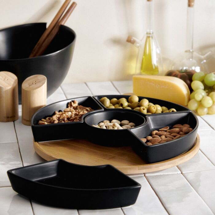 Die FINCAN Servierplatte hat einen Durchmesser von 30 cm und besteht aus fünf kreisförmig angeordneten Schalen, die jeweils ideal für Snacks oder Saucen geeignet sind. Der drehbare Bambussockel sorgt für eine einfache Handhabung und ein komfortables Teilen am Tisch. Die Farbkomposition aus klassischem Schwarz und natürlichem Holz harmoniert hervorragend mit elegantem Geschirr und traditioneller Tischdekoration.