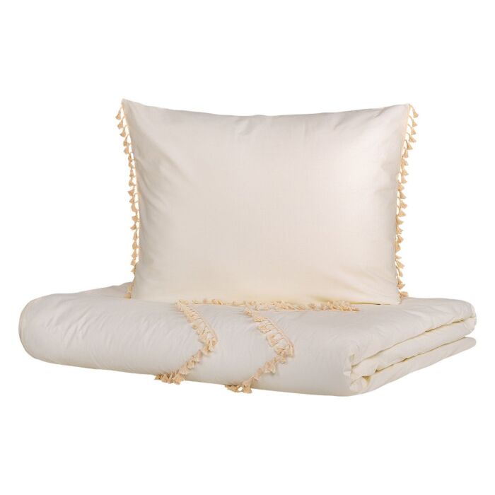 Das Bettwäscheset FRINGE besteht aus drei Elementen: zwei Kissenbezügen in der Größe 70 x 80 cm und einem großen Bettbezug mit den Maßen 160 x 200 cm . Es bestand aus einem schlichten, beigefarbenen Baumwollstoff , der mit gleichfarbigen kleinen Quasten verziert war.