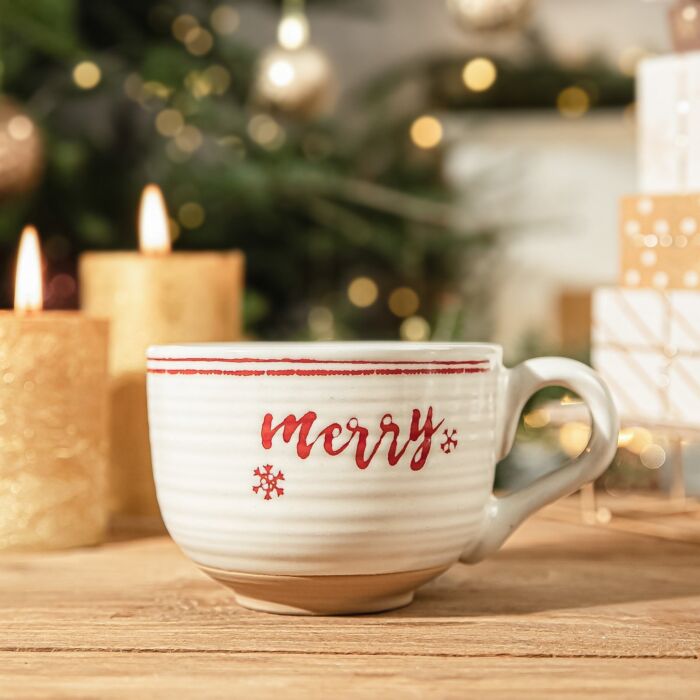 HOMLA Molly Tasse im Weihnachtsstil Weihnachtsgeschirr Tasse moderner trendiger und vielseitiger Stil Fassungsvermögen 350 ml aus hochwertigem Steingut Farbe Weiß 8 cm x 11 cm