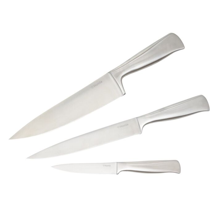 Homla RIGEL Messerset Silber 3-tlg: Scharfe Messer sind die Basis einer gut ausgestatteten Küche. Dieses Set besteht aus drei Messern unterschiedlicher Größe mit Metallgriffen. Dank der ergonomischen Griffform und der richtigen Balance sind die Messer leicht zu handhaben und bieten präzises Schneiden.