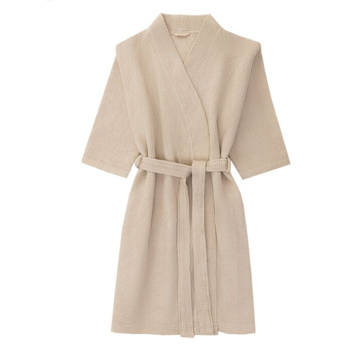Du pflegst deine Haut gerne und versuchst ihr das Beste zu geben? Dann wird Ihnen der VAFFEL Bademantel bestimmt gefallen! Das weiche und leichte Material umhüllt Ihren Körper angenehm und lässt Ihre Haut frei atmen. Der Bademantel zeichnet sich durch einen schlichten Schnitt aus, der sich dem Körper anpasst, nachdem er in der Taille mit einer Schnur gebunden wird. Es hat zwei Taschen, die kleine Gegenstände aufnehmen können, und einen Griff, mit dem Sie es an einem Badezimmerbügel aufhängen können. Die beige Farbe des Bademantels betont perfekt die Zartheit der Haut und der Waffelstoff lässt ihn gut aussehen.