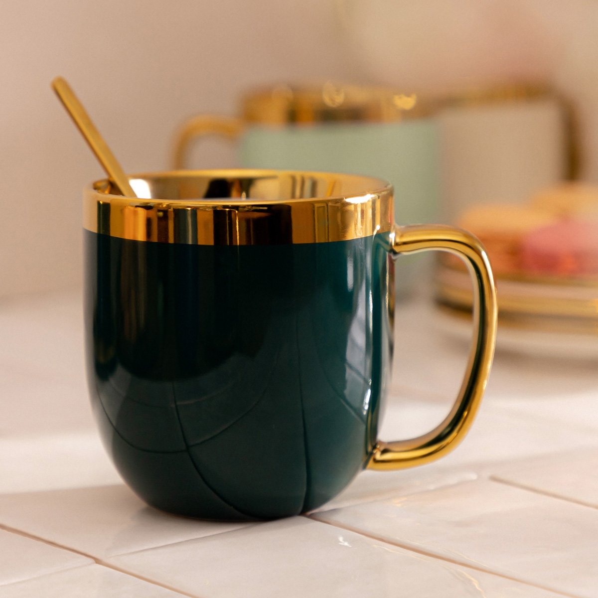 Die Tasse ist sowohl funktional als auch ästhetisch ansprechend gestaltet. Die Goldverzierungen und das Smaragd-Design machen sie zu einem Blickfang auf jedem Tisch. Der Löffel ergänzt das Set perfekt und verleiht ihm eine elegante Vollendung.
