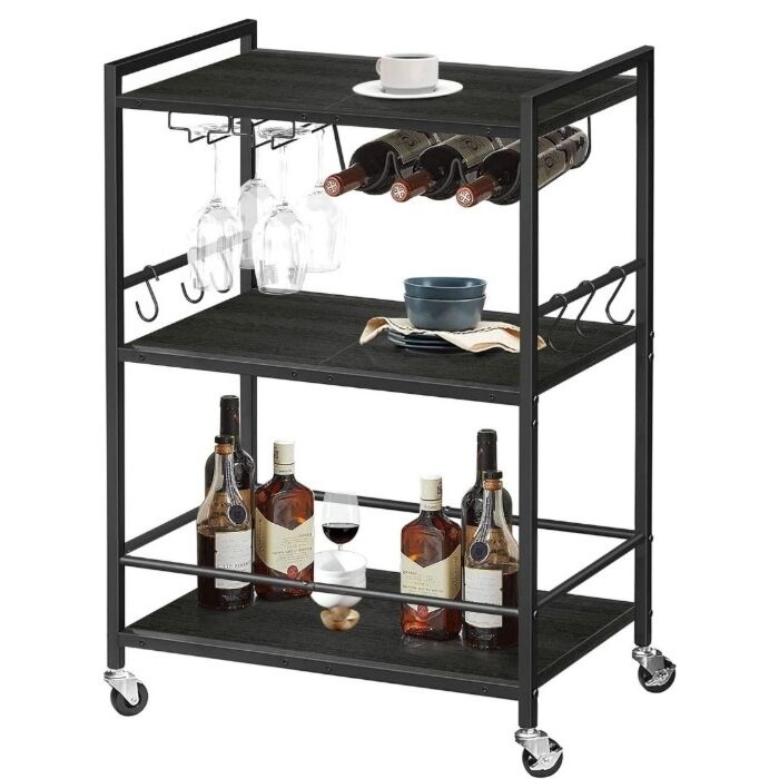 Dieser Servierwagen ist mit einem praktischen Griff ausgestattet, der eine einfache Richtungssteuerung ermöglicht. Zusätzlich bietet er 6 S-förmige Haken, die perfekt zum Aufhängen von Küchenutensilien wie Tassen oder Kochlöffeln geeignet sind. Ein weiterer Pluspunkt ist das Schutzgitter auf der unteren Ablage, das verhindert, dass Flaschen herunterfallen, und somit die gesammelten Barartikel sicher präsentiert.