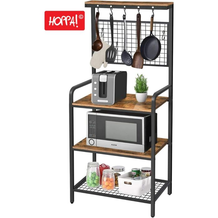 Das Hoppa! Bäckerregal ist ein multifunktionales Aufbewahrungsregal, das verschiedene Zwecke in der Küche erfüllt. Es kann als Kaffeebar, Kücheninsel, Mikrowellenständer, Gewürzregal-Organizer und Präsentationsregal verwendet werden. Mit 3 großen Ablageflächen und 1 oberem Regalboden bietet dieses Regal ausreichend Platz zum Verstauen verschiedener Küchenutensilien wie Kaffeekannen, Teller, Pflanzen und Küchengeräte.