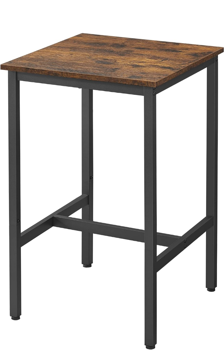 Der Stehtisch misst 60 x 60 x 92 cm und besteht aus hochwertiger Spanplatte und einem stabilen Stahlgestell. Mit einem Gewicht von nur 7 kg ist er dennoch robust und langlebig. Die rustikale Braun-Schwarz-Kombination verleiht ihm seinen einzigartigen Charme.