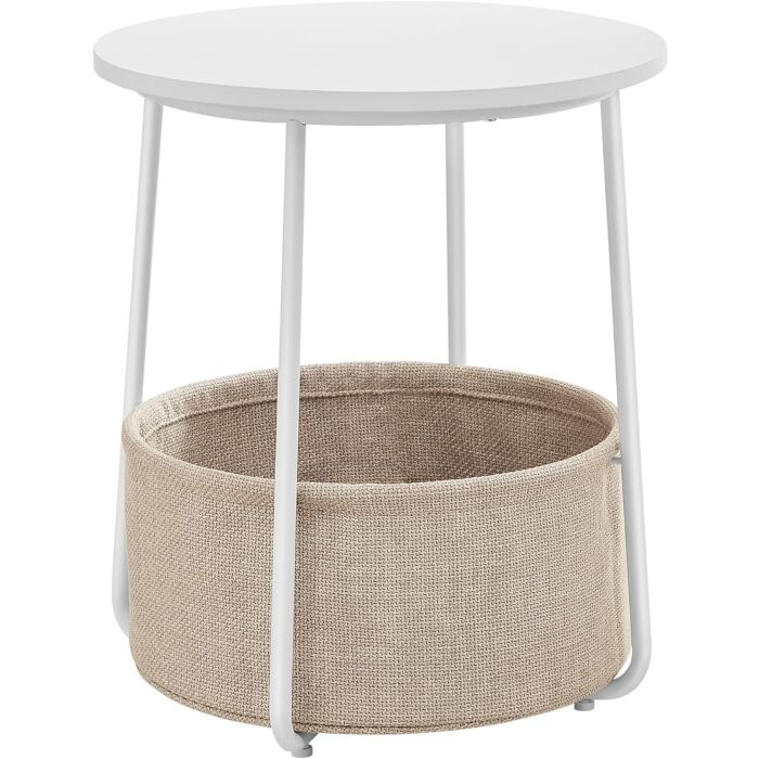 Die runde Bijzettafel mit einer hochwertigen Polyester-Mand bietet sowohl praktische Nutzung als auch ästhetische Ansprüche. Die klare Linienführung und das moderne Design machen sie zu einem attraktiven Möbelstück für Wohn- und Schlafzimmer.