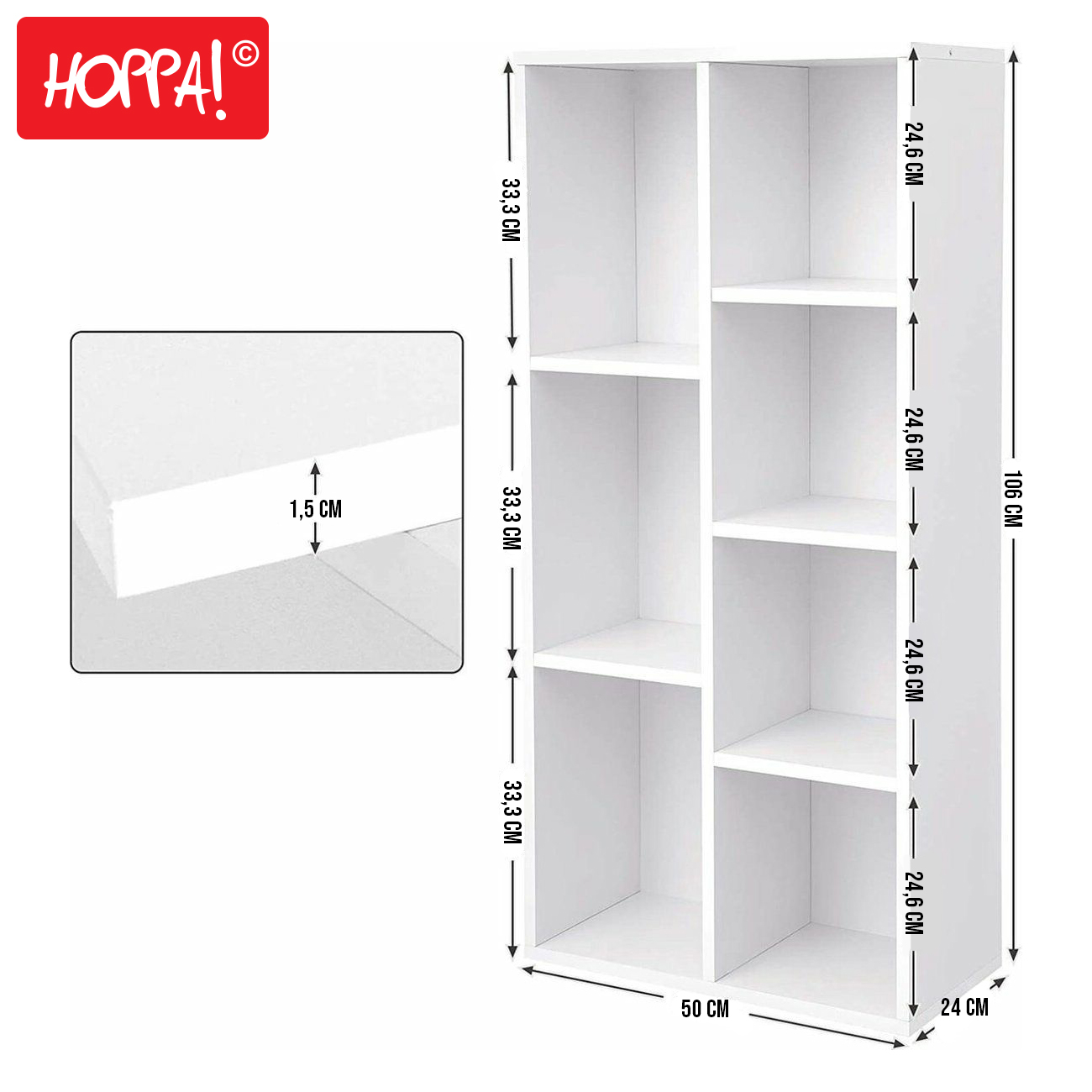 Das Hoppa! Bücherregal mit 6 Ebenen in Weiß aus Holz bietet geräumigen Stauraum in einem praktischen und dekorativen Design. Egal, ob Sie Spielzeug, Bücher oder Sammlerstücke präsentieren möchten, dieser freistehende Schrank ist die ideale Lösung. Mit 2 Befestigungselementen ausgestattet, ist er sicher und stabil in jedem Raum nutzbar.