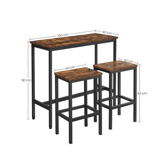 Der Bartisch hat die Maße 100 x 40 x 90 cm, während die zwei Barhocker jeweils 30 x 40 x 65 cm messen. Die Kombination aus Metallgestell und rustikaler Spanplatte verleiht dem Set eine robuste Struktur und ein zeitloses Aussehen.