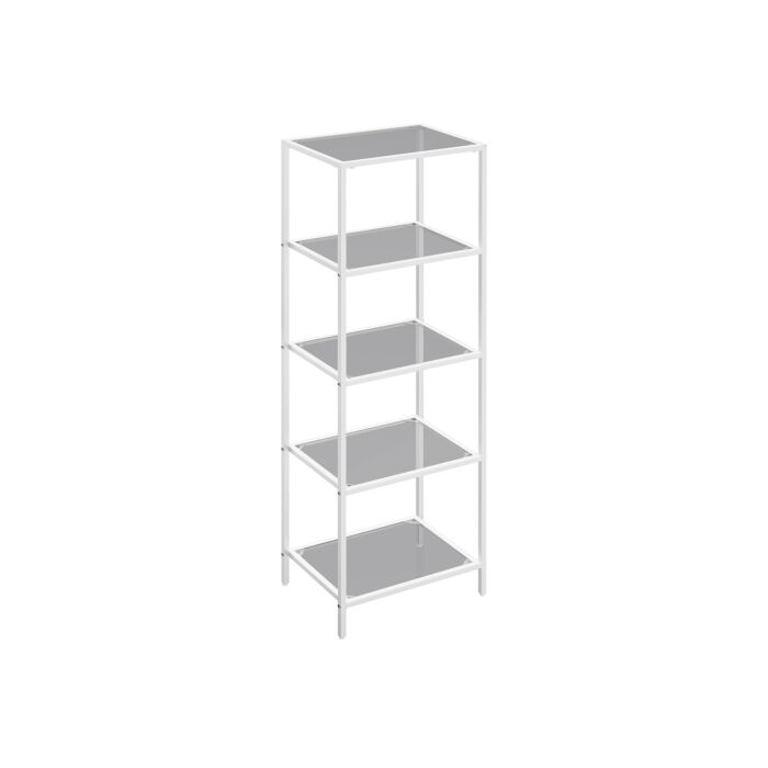 Mit einer Grundfläche von 30 x 40 cm und einer Höhe von 124,5 cm maximieren Sie mit diesem 5-stufigen Regal Ihren vertikalen Stauraum. Das Regal besteht aus 4 mm dickem gehärtetem Glas und einem stabilen Stahlrahmen.