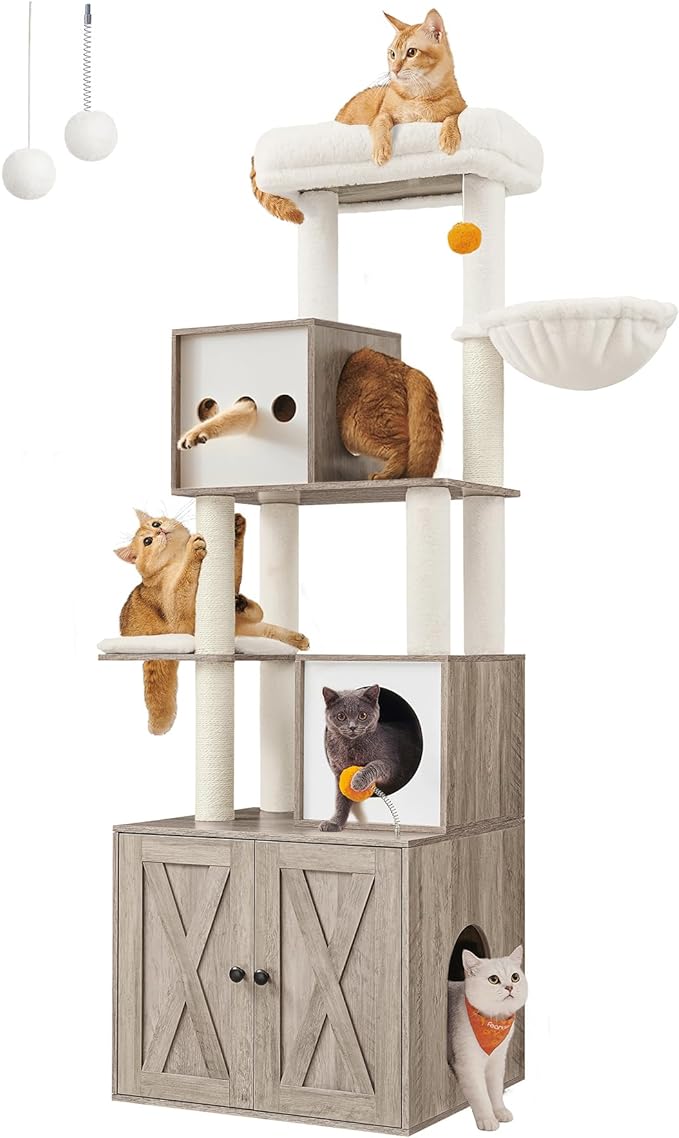 [2-in-1 kattenhuis] krabpaal en kattentoiletkast in ��n: dit kattenmeubel biedt je harige vriend een eigen ruimte. Plaats hem in een hoek, alles wat je nodig hebt is op ��n plaats � een echte ruimtebesparing [Springen, kijken, krabben] Het meertraps ontwerp vergemakkelijkt het op- en afdalen. Het platform boven is ideaal om te observeren. Meerdere krabzuilen voldoen aan het natuurlijke krassinstinct van je vachtneuzen Comfortabel en wollig: de kussens bestaan uit 500 g/m� pluche � nog zachter en wolliger dan conventionele pluche, zodat je viervoeter op deze kattenkrabpaal heel comfortabel kan ontspannen en dutjes kunnen doen Gemakkelijk te reinigen: de kattenbak laat minder kattenbakvulling uitvallen; het oppervlak is gemakkelijk te reinigen met een doekje; het kussen kan met een pluisroller of kattenkam worden gereinigd, bovendien is het afneembaar en machinewasbaar Stabiel en veilig: met de verstelbare poten staat de kattenboom ook op licht oneffen vloeren stabiel; bevestig het kattenhuis met de meegeleverde kantelbeveiliging aan de muur om een veilige omgeving voor je viervoeter en jou te cre�ren 2 vervangende pluche ballen: naast de 2 oranje pluche ballen die je vachtneuzen grenzeloos plezier bieden, wordt deze kattentoren geleverd met 2 reserve pluche ballen zonder bel, zodat je ze indien nodig kunt vervangen
