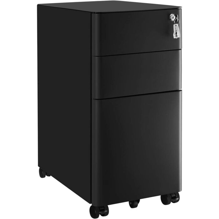 Der Rollcontainer ist mit Rollen ausgestattet, die eine einfache Bewegung im Raum ermöglichen. Zudem verfügt er über ein Schloss, um vertrauliche Dokumente sicher aufzubewahren. Das zeitlose schwarze Finish sorgt für eine elegante Optik und passt zu verschiedenen Büroeinrichtungen.