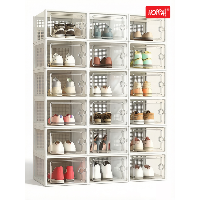- Organisieren Sie Ihre Schuhsammlung mit 18 transparenten Schuhkartons.