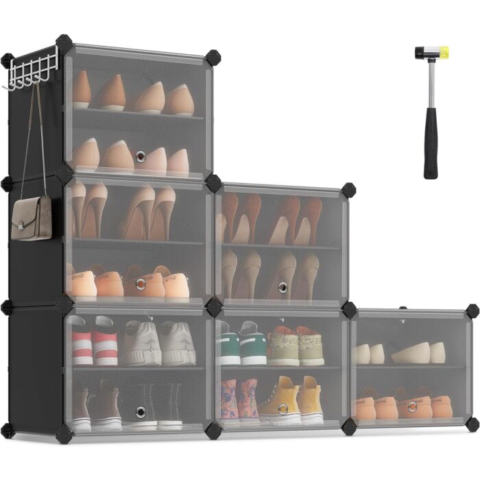 Het Hoppa! Schoenenrek met 6 vakken is de perfecte oplossing voor het organiseren van je schoenen en kleding. Met voldoende opbergruimte voor 24 paar schoenen en extra ruimte voor tassen en kleding, helpt dit rek je om optimaal gebruik te maken van de beschikbare ruimte. De zijdelingse haken bieden extra mogelijkheden voor het ophangen van accessoires.