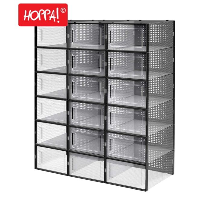 Optimieren Sie die Ordnung Ihrer Schuhsammlung mit den 18 Schuhkartons im Set von Hoppa!. Der transparente Korpus in Kombination mit der transparenten Tür ermöglicht es Ihnen, Ihre Schuhe auf einen Blick zu identifizieren und das lästige Suchen in verschiedenen Kartons zu vermeiden. Die Montage dieser Kunststoffboxen ist mühelos – einfach die drei Teile zusammensetzen und schon haben Sie einen neuen Schuhorganizer in den Maßen von 30 x 22,5 x 13,5 cm, der genügend Platz für Schuhe bis Größe 42 bietet.