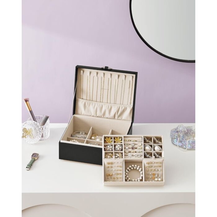 - Schickes und originelles Design in den Farben Schwarz und Gold - Praktischer Schwebeeffekt - Verschiedene Aufbewahrungsmöglichkeiten für verschiedene Schmuckstücke und Accessoires - Praktische Funktionen wie abnehmbare Trennwände und Seitengriffe - Robustes und langlebiges Material mit weichem Futter zum Schutz des Schmucks