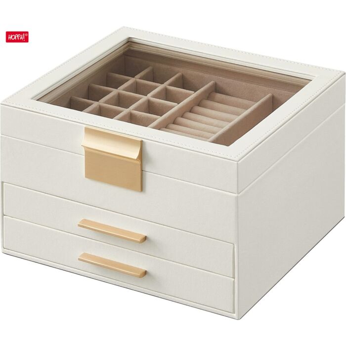 Hoppa! | Schmuckschatulle mit Glasdeckel | 3 Ebenen & 2 Schubladen | Weiß