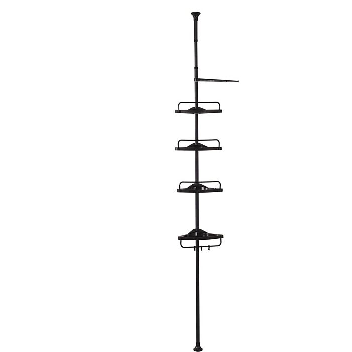 Das Hoppa! verstellbare Badezimmer-Eckregal ist die ideale Lösung für die effektive Nutzung von vertikalem Raum in Ihrem Badezimmer. Mit einer anpassbaren Höhe von 85 bis 305 cm passt es perfekt in jede Nische oder Ecke, und seine elegante schwarze Farbgebung fügt sich harmonisch in moderne Badezimmerstile ein. Die robuste Konstruktion verfügt über vier geräumige Schubladen, die zusätzlichen Stauraum bieten, sowie drei Haken, an denen Handtücher oder Duschaccessoires bequem aufgehängt werden können.