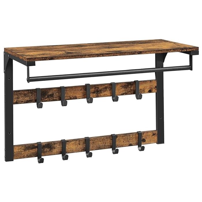 - 10 abnehmbare Haken für anpassbaren Stauraum - Belastbarkeit: 20 kg Regal, 5 kg pro Haken, 15 kg Stange - Industriedesign in Vintage-Braun