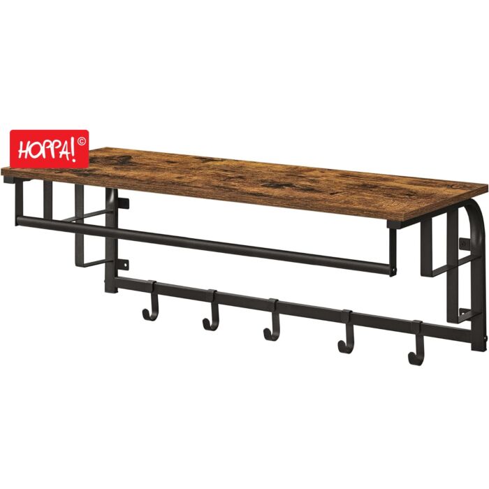 Hoppa! | Wandkast | Met Legbord en 5 Uitneembare Haken | Hoedenplank | 80 x 30 x 27 cm | Walnoot Bruin-Zwart