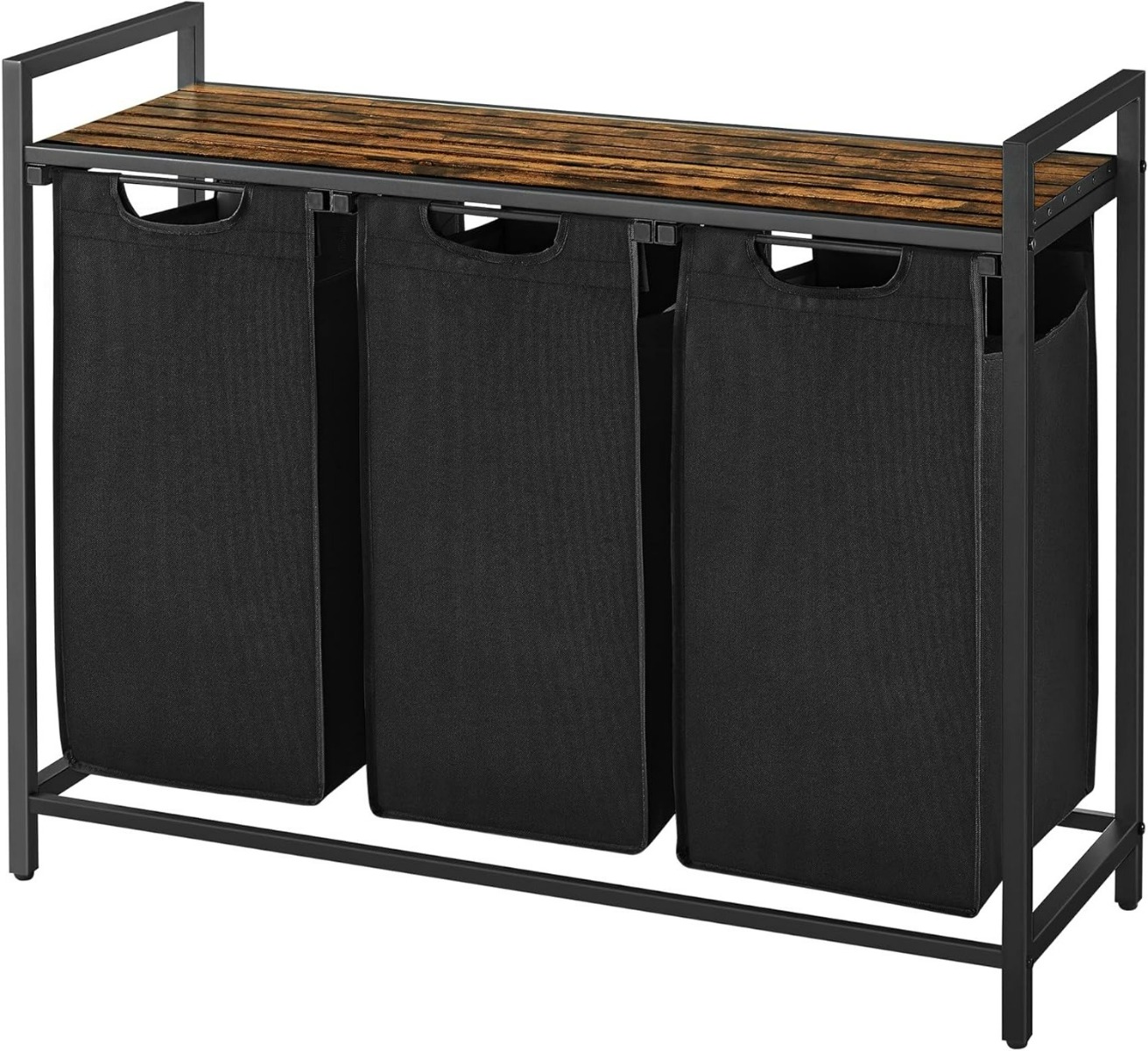 Die drei Oxford-Stoffbeutel sind leicht herausziehbar und mit einem praktischen Klettverschluss ausgestattet. Dies ermöglicht ein schnelles Entfernen der Wäschebeutel, sodass Sie diese bequem zur Waschmaschine transportieren können. Das schlichte, rustikale Design in Braun und Schwarz fügt sich nahtlos in jede Wohnumgebung ein und verleiht einem Raum einen modernen Akzent.