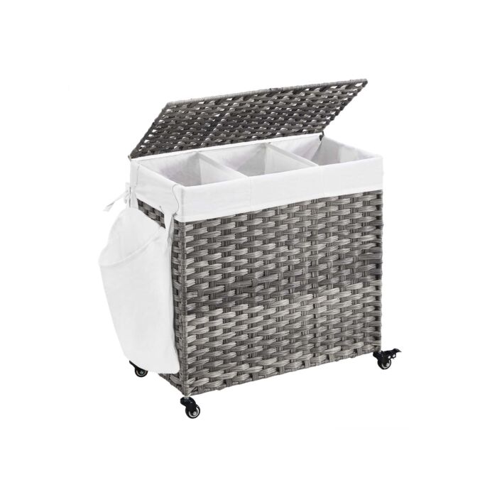Hoppa! | Wäschekorb | handgeflochten - 140 L - Polyrattan - 3 Fächer - abnehmbare Tasche - Deckel - Griffe - 66 x 33 x 60 cm - Grau