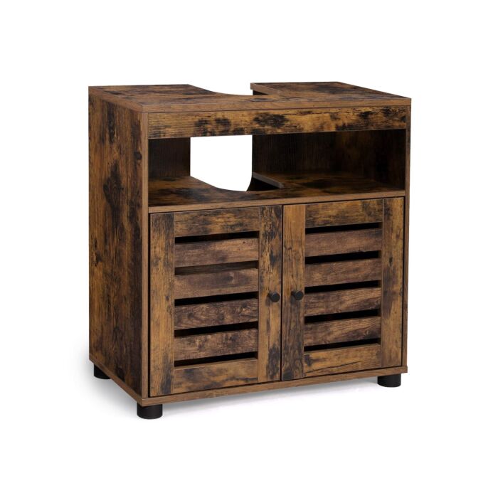 Der Schrank verfügt über zwei stilvolle Lamellentüren, die einen Hauch von Vintage-Charme verleihen. Hinter den Türen finden Sie drei verstellbare Einlegeböden, die es Ihnen ermöglichen, Stauraum nach Bedarf zu gestalten. Diese Flexibilität ist ideal, um sowohl kleinere als auch größere Gegenstände ordentlich zu verstauen. Zudem gibt es eine praktische Öffnung von 20 x 15 cm für den Siphon, die es ermöglicht, den Schrank nahtlos unter dem Waschbecken zu platzieren.