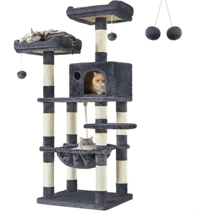 Dieser Kratzbaum besticht durch seine hohe Stabilität mit holzverstärkter Bodenplatte, robuste Sisalfasern, kuscheligen Plüschbezug, Katzenhaus, Aussichtsplattformen, Hängematte und einer Treppe für einfacheres Erreichen der Plattformen.