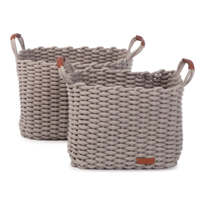 Die Kidsdepot Dengu Manden Set in grijs ist eine elegante Aufbewahrungslösung für Ihr Zuhause. Hergestellt aus geflochtenem Kordelmaterial mit Ledergriffen, fügen diese Körbe sowohl Funktionalität als auch Stil hinzu. Die hochwertige Konstruktion gewährleistet, dass die Körbe auch ohne Inhalt stabil stehen.