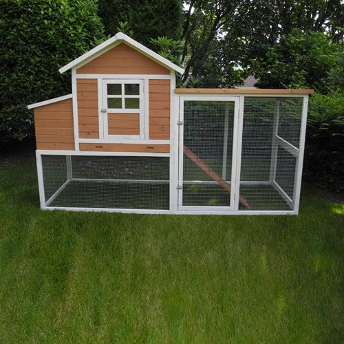 Dieser Hühnerstall ist mit einer herausnehmbaren tiefen Schublade ausgestattet, die die Reinigung erheblich erleichtert. Eine Eingangstür mit Plexiglasfenstern sorgt für ausreichend Tageslicht und Sicherheit, während die robuste Konstruktion dafür sorgt, dass Ihre Hühner immer einen geschützten Rückzugsort haben.