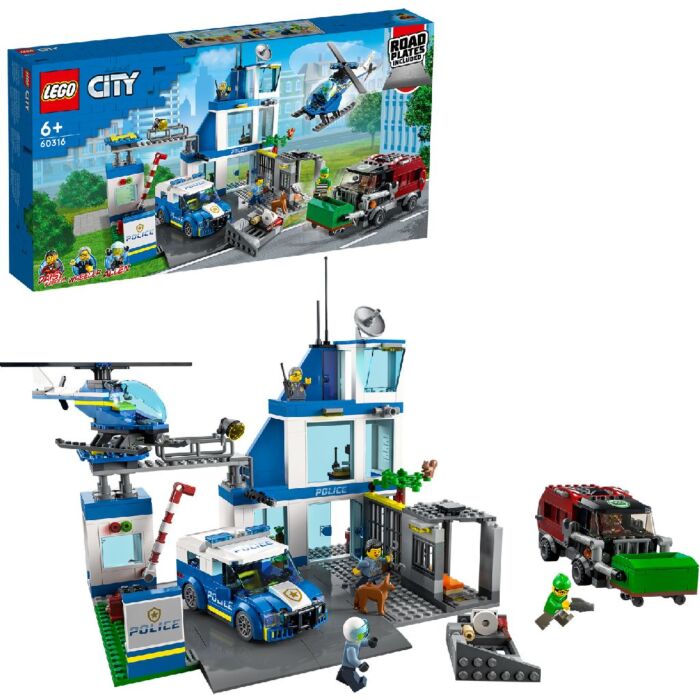 Die dreistöckige LEGO City Polizeiwache steckt voller inspirierender Details, darunter ein Gefängnis mit Fluchtfunktion, ein Ganovenhof und ein Hundetrainingsgelände. Dieses Konstruktionsspielzeug enthält außerdem einen Spielzeug-Polizeiwagen, einen Hubschrauber und einen Schurken-Müllwagen, eine Hundefigur sowie eine Straßenplatte zum Verbinden anderer Spielsets. Fügen Sie einfach die fünf Minifiguren hinzu, darunter drei Charaktere aus der TV-Serie LEGO City Adventures, und der Spaß kann beginnen. Enthalten sind 668 Teile und das Set ist geeignet für Kinder ab 6 Jahren.