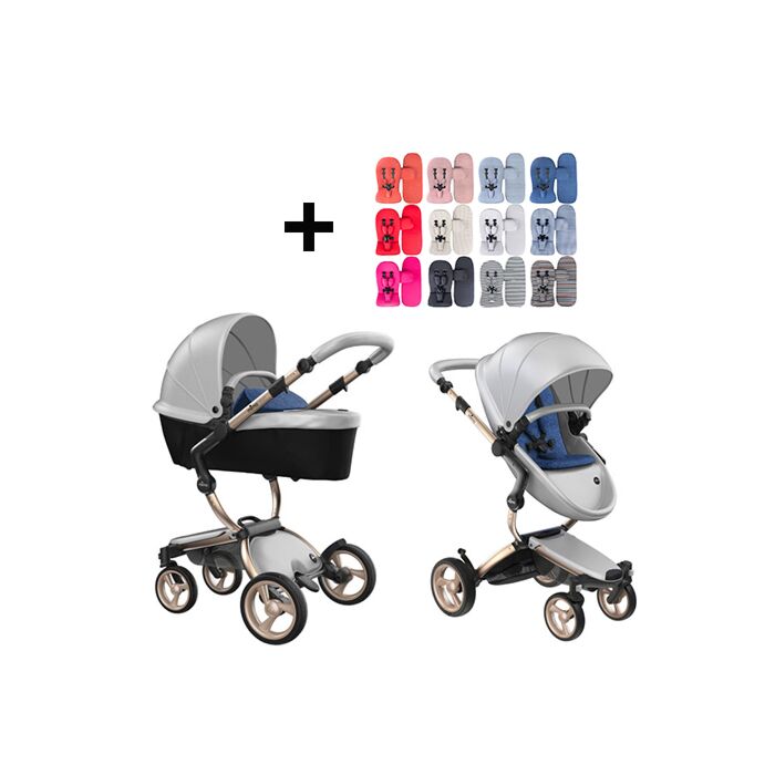 Mima Xari Kinderwagen | Frame - Champagne | Zitting + Kap - Argento | Starter Pack - Denim Blue