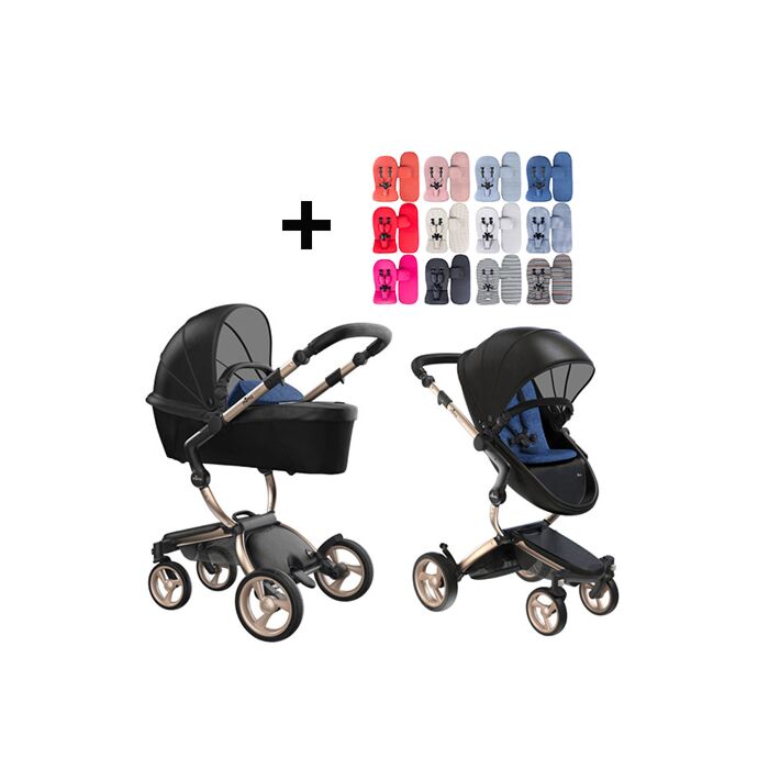Mima Xari Kinderwagen | Frame - Champagne | Zitting + Kap - Black | Starter Pack - Denim Blue