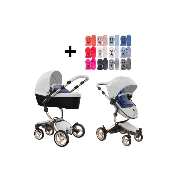 Mima Xari Kinderwagen | Frame - Champagne | Zitting + Kap - Snow White | Starter Pack - Denim Blue