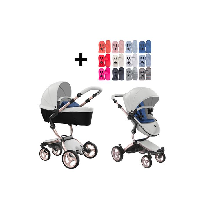 Mima Xari Kinderwagen | Frame - Rose Gold | Zitting + Kap - Snow White | Starter Pack - Denim Blue