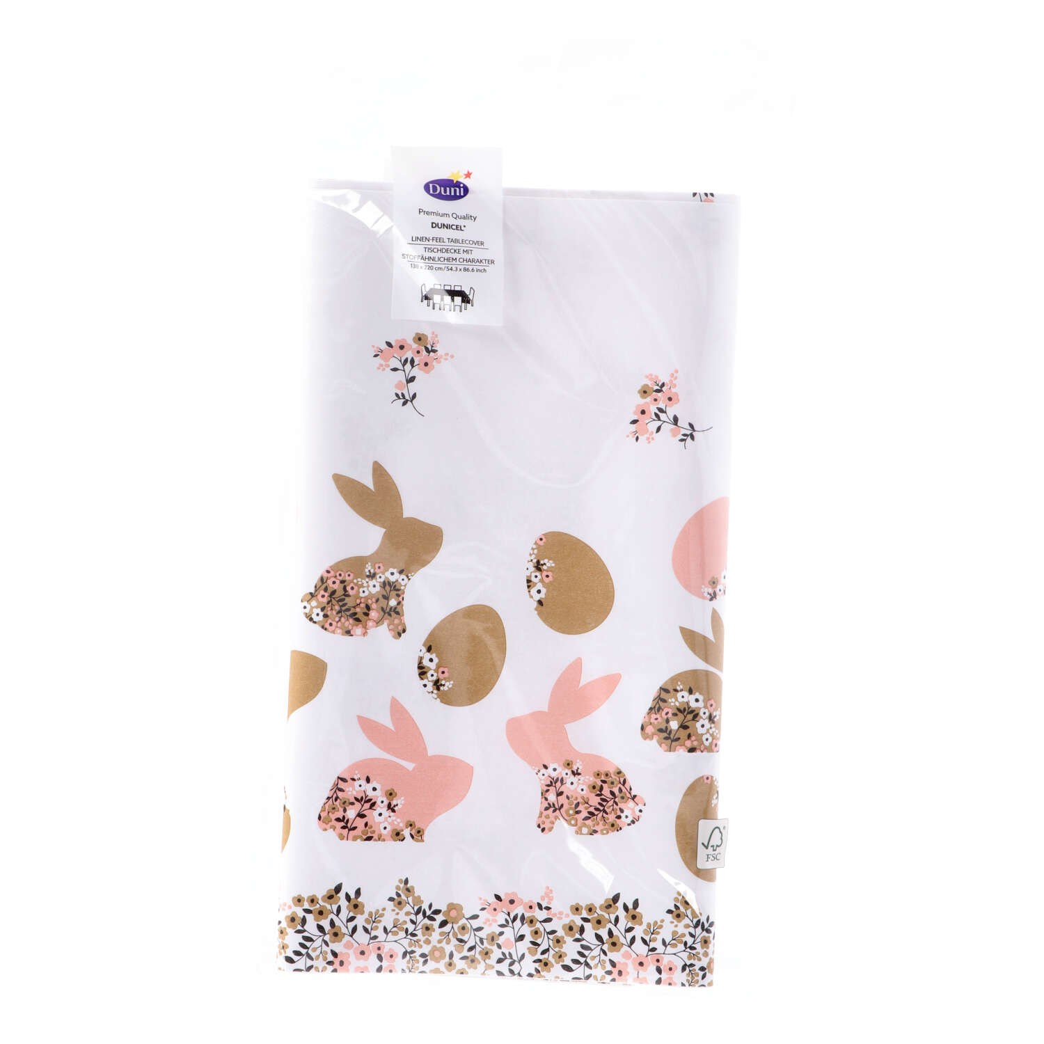 • Stimmungsvolle Oster-Tischdecke mit blühenden Hasenmotiven