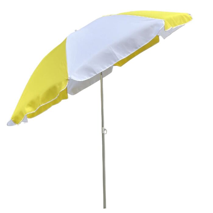 Dank des knickbaren Beins kann der Sonnenschirm mühelos ausgerichtet werden, um optimalen Schutz zu bieten. Die gelb-weißen Oberflächen verleihen ihm ein ansprechendes Aussehen.