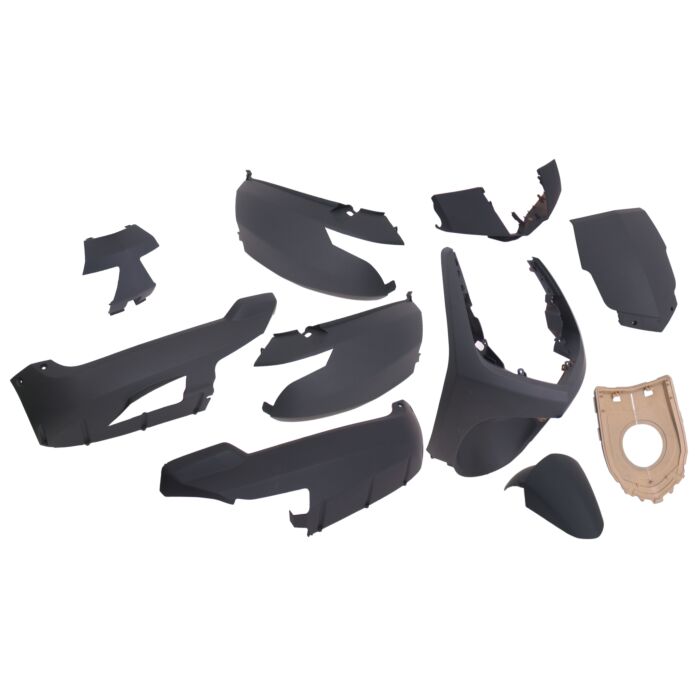 - Bestehend aus Lenkerabdeckung, Vorderseite, Kotflügel vorne, Seitenschilder, Schutzabdeckung vorne, unteren Bildschirmen und Heckscheibe