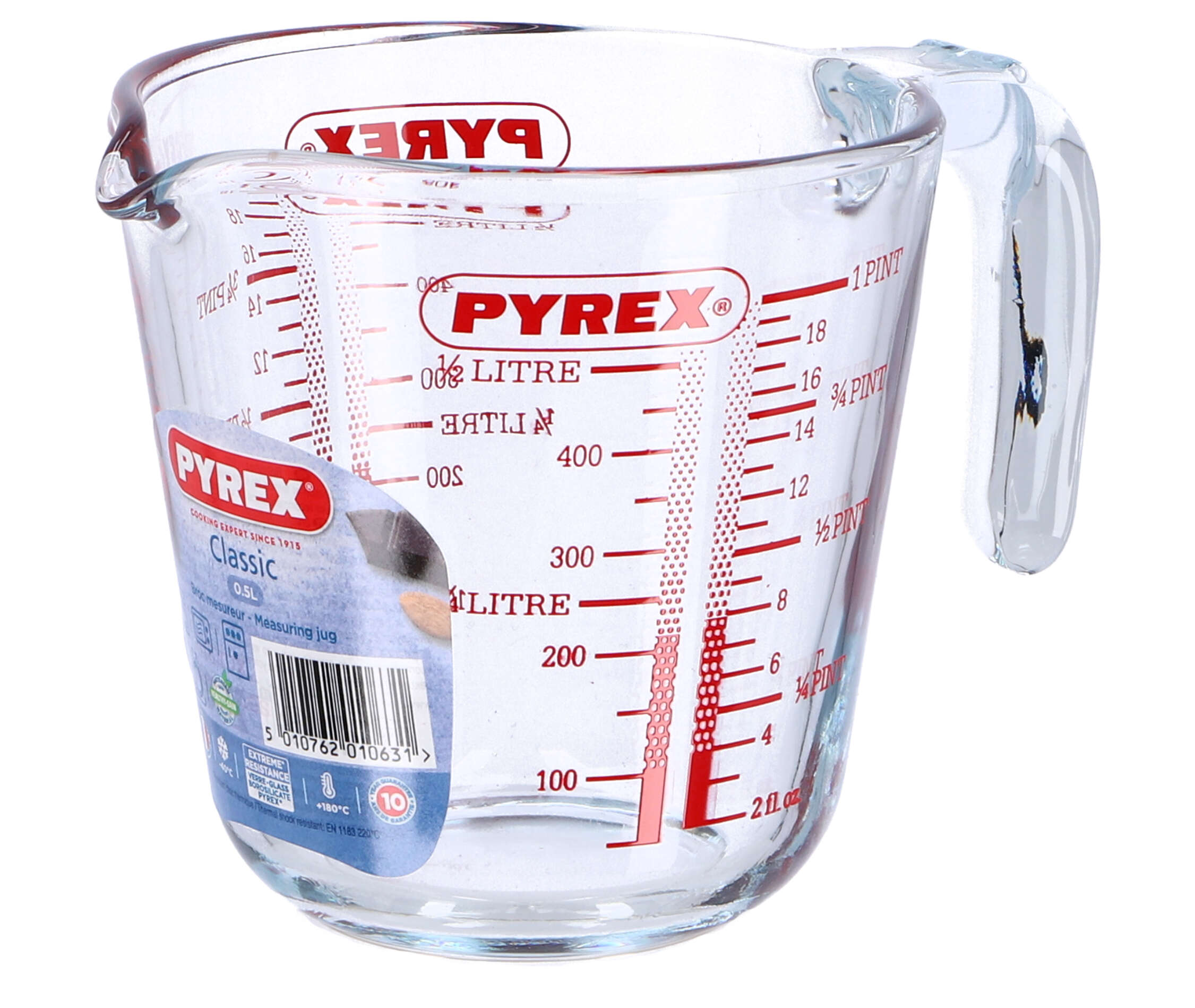 Pyrex Prep & Store Classic Messbecher ist ein unverzichtbares Küchenwerkzeug für präzise Messungen beim Kochen oder Backen. Dieser klassische 0,5-Liter-Messbecher besteht aus hochwertigem Glas, was ihn langlebig und leicht zu reinigen macht.