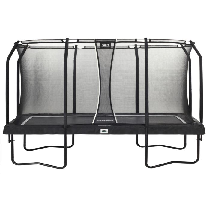 Das Salta Premium Black Edition Trampolin hat die Maße 244x396cm und ist mit einem korrosionsbeständigen Stahlrahmen sowie goldenen Doppelkegelfedern ausgestattet.