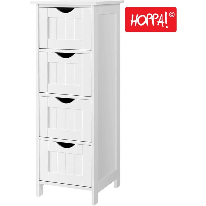Die Hoppa! Badezimmermöbel in Weiß bestehen aus MDF und haben die Maße 30 x 30 x 82 cm. Diese Möbelstücke sind durch ihre beidseitig lackierten Platten mit einer glatten und wasserabweisenden Oberfläche besonders pflegeleicht und langlebig.
