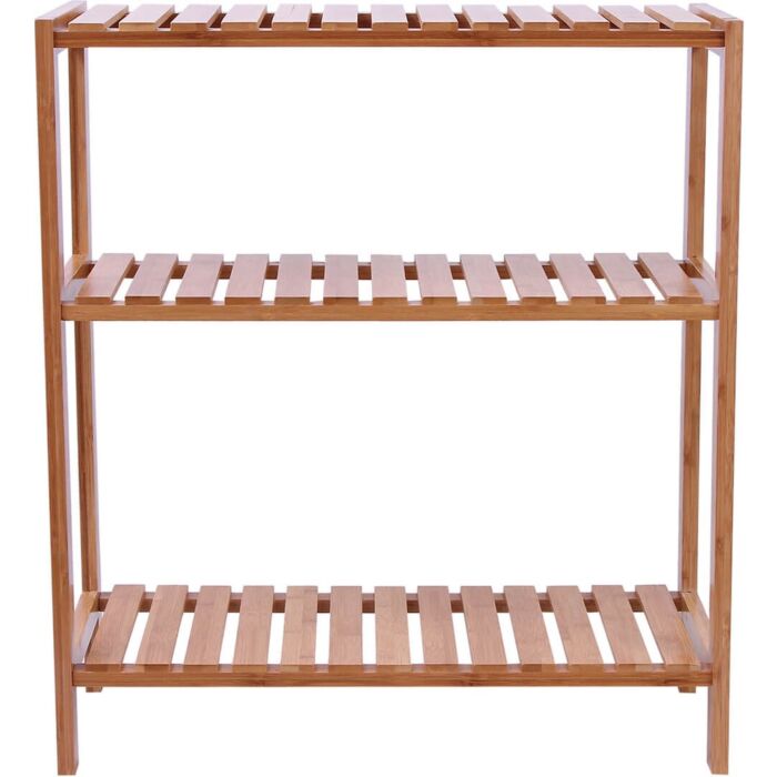 Das Regal hat die Maße 66 x 26 x 60 cm und besteht vollständig aus Bambus, was für eine natürliche Optik und Langlebigkeit sorgt.