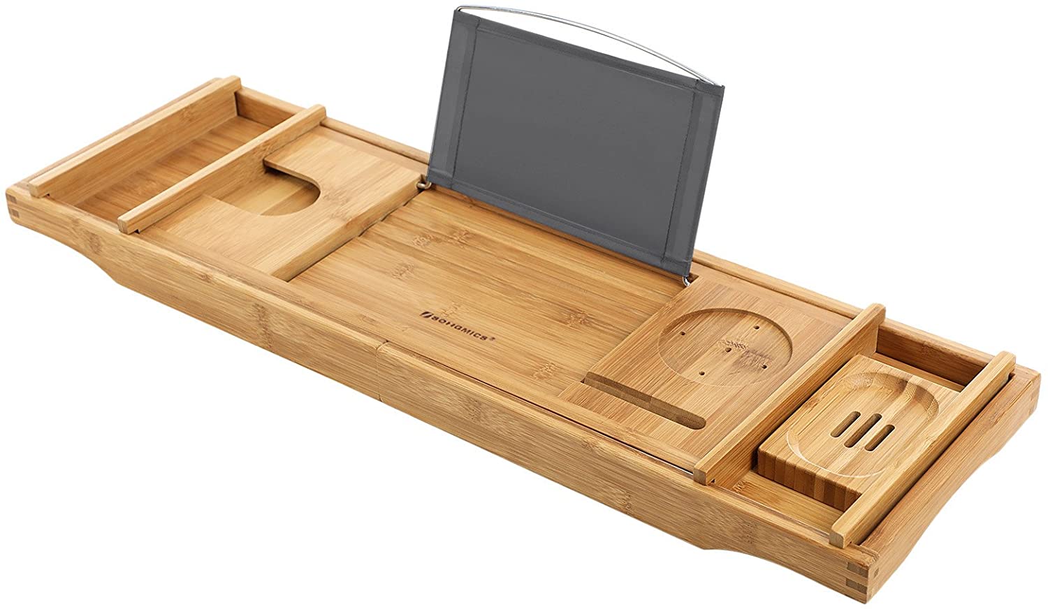 Das Badebrett ist aus Bambus gefertigt und verstellbar von 78 bis 109 cm in der Breite, 6,3 cm in der Höhe und 24,5 cm in der Tiefe. Es bietet eine Belastbarkeit von bis zu 3 kg und wiegt 1,96 kg.