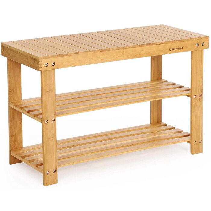 Die bekannte Unannehmlichkeit, die Schuhe im Flur anzuziehen, während es keine Sitzgelegenheit gibt, wurde mit dieser stilvollen und praktischen Bank/Schuhregal aus Bambusholz gelöst. Die Bank hat 3 Auflageflächen, die Oberseite der als Sitzgelegenheit genutzt werden kann.